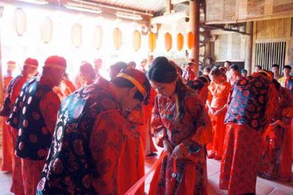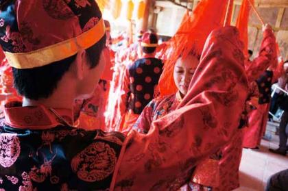 掀起娘子盖头来,从此幸福恩爱生活在一起 在充满喜庆的中国传统音乐声中,一对对新人手持同心结,身着象征红红火火的中式婚服,在古色古香的背景中一丝不苟地履行着各项婚礼仪式。这是记者近日在湄洲岛影视城一场中式集体婚礼中看到的一幕。18对新人红红火火地举办了一场“穿越”式集体婚礼,新人们通过中式传统婚礼感受了中国传统文化。 记者了解到,现在有不少莆田新人热衷于举办中式婚礼,希望可以穿上长袍马褂“入洞房”,于是中式集体婚礼因其节俭而又不失浪漫,更是受到新人的喜欢。