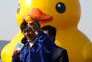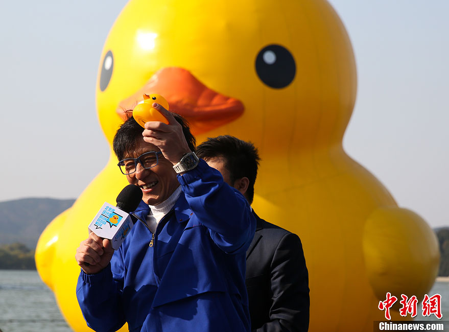 10月24日,“大黄鸭”中国之旅进入倒计时,成龙现身颐和园“跟‘鸭’说再见”的活动现场。由荷兰艺术家弗洛伦泰因·霍夫曼设计的“大黄鸭”在颐和园的展出将于10月27日结束。中新社发熊然 摄