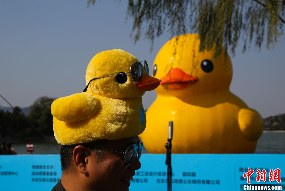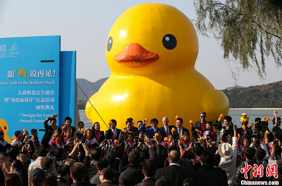 10月24日,“大黄鸭”中国之旅进入倒计时,设计师霍夫曼、成龙、北京国际设计周获奖作品的作者们一同现身颐和园“跟‘鸭’说再见”的活动现场。由荷兰艺术家弗洛伦泰因·霍夫曼设计的“大黄鸭”在颐和园的展出将于10月27日结束。中新社发熊然 摄