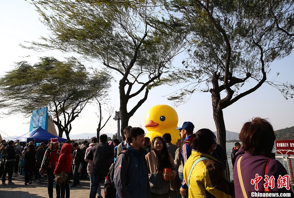 10月24日,北京颐和园的“跟‘鸭’说再见”活动,引来众多游客。由荷兰艺术家弗洛伦泰因·霍夫曼设计的“大黄鸭”在颐和园的展出将于10月27日结束。中新社发熊然 摄