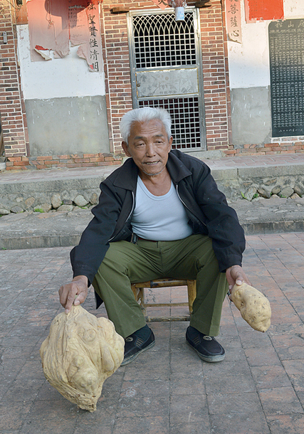 图为陈金富拿出普通地瓜和超大地瓜进行对比 据《仙游今报》报道,日前,仙游县大济镇古濑村的农民陈金富在菜地里挖出了一个“怪胎”地瓜,足有10公斤重。 10月31日,记者前往采访中看到,这个地瓜呈白色,长约40厘米,上面布满不规则的条纹,隆起的褶皱,撑出了一道道沟,地瓜的根茎部足有4厘米粗。记者用手去提,明显有分量。陈金富说,他今年65岁,务农40多年,从来没见到这么大的地瓜。他说,去年这些地瓜长势就很好,没想到今年个头更大。 听到大地瓜的奇闻,附近不少群众前来争睹这个造型奇特的大地瓜。一位村民说,普通地瓜一个一两公斤就算是重的了,四五公斤不多见,这10公斤的地瓜可是从来没见过。 据陈金富介绍,今年3月他在菜地里种了20棵地瓜苗。平时除了给地瓜浇浇水之外,也没怎么特殊照顾。想不到的是,以往种菜不怎么见结果的菜地种的地瓜长势很好,口味也十分香甜。 当记者问陈金富将如何处理这一“怪”地瓜,他笑呵呵地说,“这个地瓜很稀罕,不舍得吃掉,要摆起来供人观赏。” |