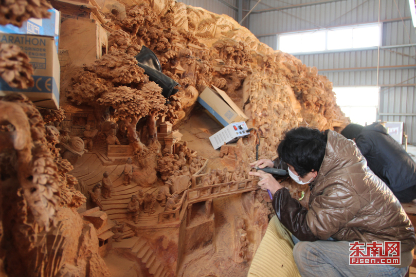 工人合力雕刻《清明上河图》
