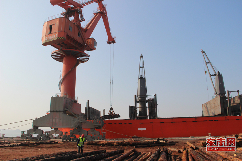 中国莆田国家级进口木材除害处理区港口作业中