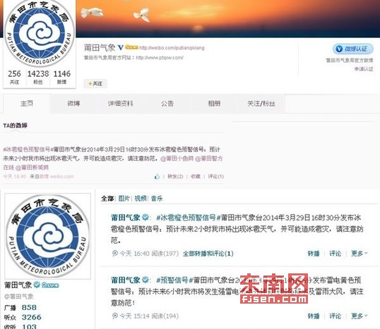 莆田气象局腾讯、新浪官方微发布冰雹橙色预警信号为昨日4时40分(3月29日截图)