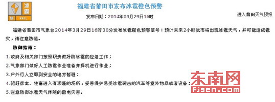 中央气象台网上,莆田市气象台发布冰雹橙色预警信号为昨日下午4时30分