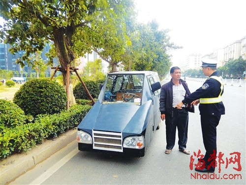 老汉私造奇特三轮电动汽车,被民警暂扣 东南网11月20日讯(海峡都市报 陈丽明 周金赞 邱明将)“17日中午,莆田笏石派出所民警在秀屿区笏石镇坝津路段发现一部造型奇特的车辆在路上快速前行。执勤民警上前将其拦下检查,发现这竟然是一部纯手工制造的电动汽车。该民警表示,自己从事交警工作多年,还是第一次见到有人开着自己制造的车辆上路。 据调查,车主黄老汉是笏石镇人,50多岁,自己购买了部分汽车零配件,闭门在家制造了二十多天,造出一部能遮风挡雨的电动汽车,用于接送自家孙子及邻家小孩上放学。民警发现,该车虽说五脏俱全,但明显属粗制滥造,车子的转向和刹车功能均无法正常有效使用。黄老汉被罚款500元,违法车辆被暂扣。