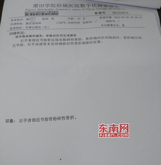 “5月23日、25日两次不同的诊断结果,出自同一医生。”黄先生说,5月26日,他用真名再次在涵江医院复查,结果还是“右手食指近节指骨骨折”。当天,他还前往莆田学院附属医院新区急诊科,做右手食指专项检查,结果为“右手食指近节指骨粉碎性骨折”。