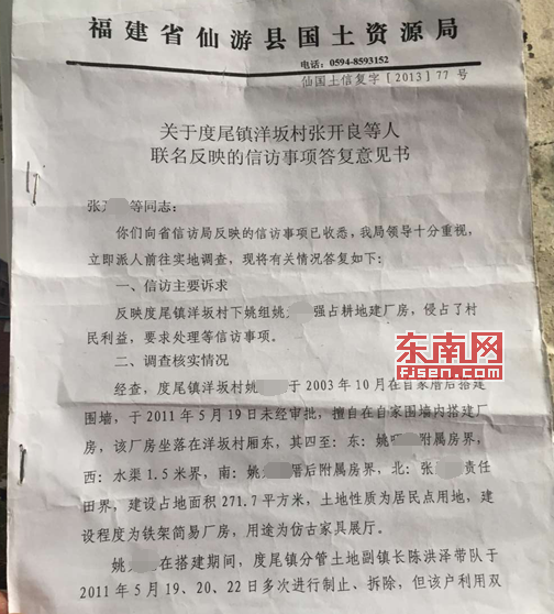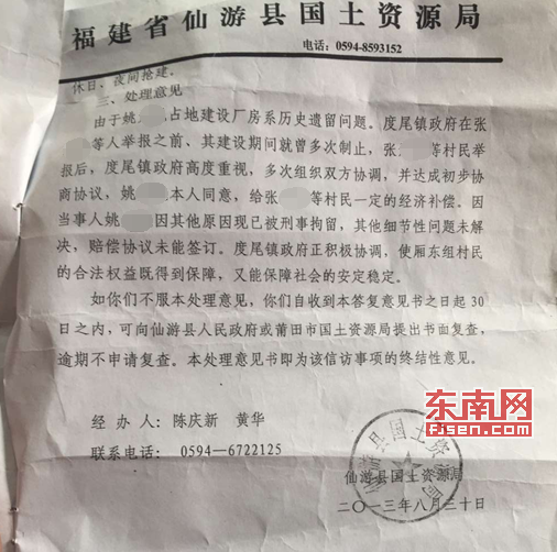 仙游县国土资源局关于此事的答复意见书 部门: 列入历史遗留问题,调解不成建议走法律途径 对此,仙游度尾镇副镇长、洋坂村包片领导陈先生表示,自己今年6月份才分管该村,对具体情况不是很清楚,让记者直接向洋坂村了解。洋坂村党支部书记吴文荣表示,自己于2015年9月份上任,对于2011年违建又为何未被拆除,他也不清楚。 “不过,经向姚某了解得知,1994年姚某用座落在洋坂村水电站下的溪田(面积0.5亩)与厢东组座落在顶姚仙永公路北边的农田(面积0.48亩)交换。姚某曾拿合同给我看,但目前姚某被判刑在服役拿不到合同。”吴文荣说。对此,张女士反驳说,“若1994年双方已交换田地,2001年至2006年期间,姚某怎么可能会支付田租?!” “在双方都同意的情况下,我已组织调解多次了,最后综合双方意见整理了调解协议书,厢东组说有几处还要在修改,但是半个月过去了,也没跟我联系。”吴文荣说。 仙游县国土资源局局长李自力表示,2012年12月份,政府出台文件规定2013年1月份以前的违章建筑列为历史遗留问题,保留现状。“若经部门调解不成,建议群众通过法律途径维权。”李自力说。 那“赔偿款13万元,其中由村部支付7万元”是怎么一回事?吴文荣称,因是集体信访案件,县信访局在该方面有一定的资助,“这是他们(县信访局)下拨下来的,村委会哪里有钱。”对此,仙游县信访局局长黄志雄表示,信访局没有这方面的政策和资金。 对此,东南网还将继续关注! |