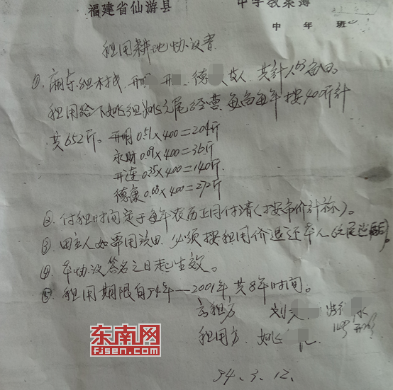 1994年双方签订的租地协议书 东南网莆田9月3日讯(本网记者 李妙珠)“我们从2011年开始反映,当年县政府回复是违规建筑;2012年,时任县委书记批示本县国土局及度尾镇人民政府将建筑强制拆除;2013年和2015年,县分管领导也连续下3次批示,要相关部门依规处理,但至今仍未解决。”日前,莆田仙游县度尾镇洋坂村厢东组村民通过东南网《直通屏山 省委领导留言板》反映,称村里原本租给同村下姚组村民的农田,被擅自改变用途修建厂房,他们反映多年至今未解决。【留言详情】 反映: 田地被改变用途建厂房,反映多年未解决 仙游度尾镇洋坂村厢东组村民张先生介绍,1994年,同村下姚组村民姚某租用厢东组农田1.63亩,双方约定租期8年,租金每亩每年400斤稻谷。2001年,姚某如期归还田地。同年,村里重新进行田地分配后,姚某再次向厢东组张某镇两兄弟租用农田约0.5分,双方约定一年一百斤稻谷,租期5年。 “2007年,这块田地又分给我们,姚某表示要继续租用。以往是一年拿一次租金,但是自2007年以后,他却一直不肯支付,至今已欠了我们10年的田租。”张女士说,不仅如此,2011年姚某甚至未经同意,便私自在自家田地上搭建厂房。 “这是我们厢东组集体的土地,得知姚某擅自将田地改变用途后,我们村民集体向相关部门反映。当时部门也有下来执法,但是最后姚某的厂房还是建了起来。”厢东组村民一村民说。 厢东组张组长告诉东南网记者,2012年,时任仙游县委书记曾批示本县国土局及度尾镇人民政府将厂房强制拆除;2013年、2015年,仙游县分管领导也连续下3次批示,要求相关部门依规处理,但至今仍未解决。“为了拿回属于我们的田地,5年来,村民们多次向各级部门反映,至今也花费了8万多元。”张组长说,之后,洋坂村村书记拿出一张协议书,说“在1994年时候,姚某就已经将该地与村民以地换地,另外赔偿了13万元。其中洋坂村委员会一次性支付7万元,作为补助”。 “且不说1994年根本没有换地一事,姚某个人私建厂房,为什么公家要拿钱帮其补助?”厢东组有村民质疑道。厢东组村民表示,他们现在只希望相关部门能拆除地面建筑物,归还属于他们的田地。