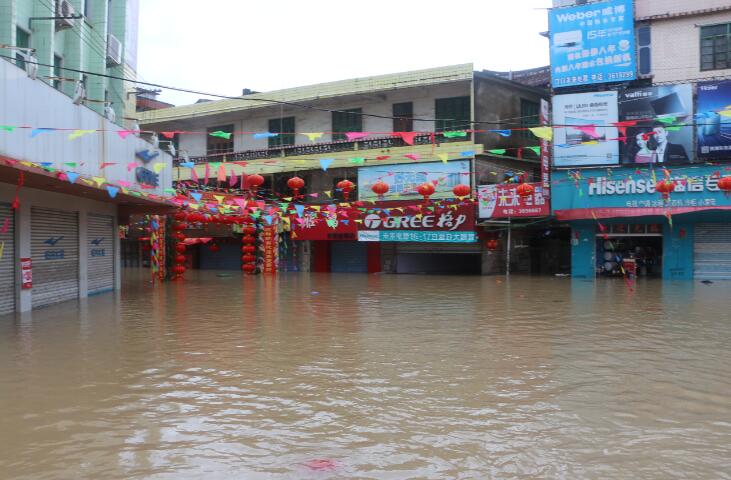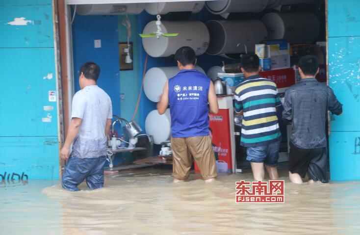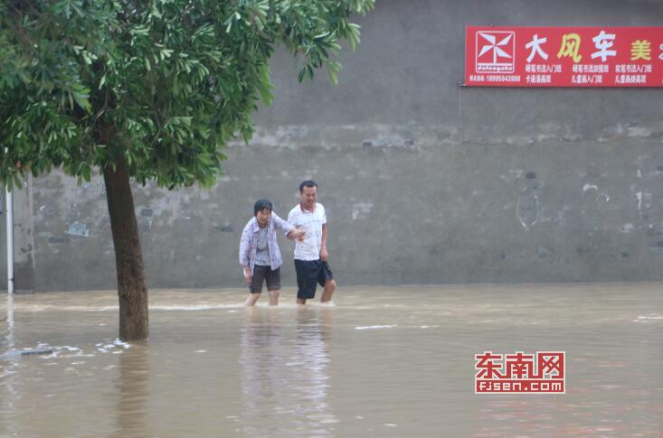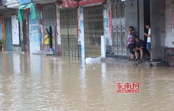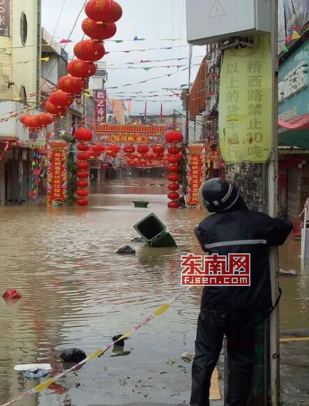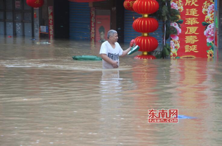 距离蒜溪不远的萩芦溪,溪水水势来得比蒜溪更为凶猛。在江口龙津街,路面也被泥黄大水淹没,有车辆直接泡在水里,两边的店面被淹最深处达到1米左右。附近的几条小巷子,同样存在不同程度被淹的情况。被淹较为严重的江口旧市场一带,积水最深达半层楼高。东南网记者从沿街一些店面可以看到,店内有不少货物被淹。有市民淌水行走时,深处的积水甚至已经快淹没到了胸口。