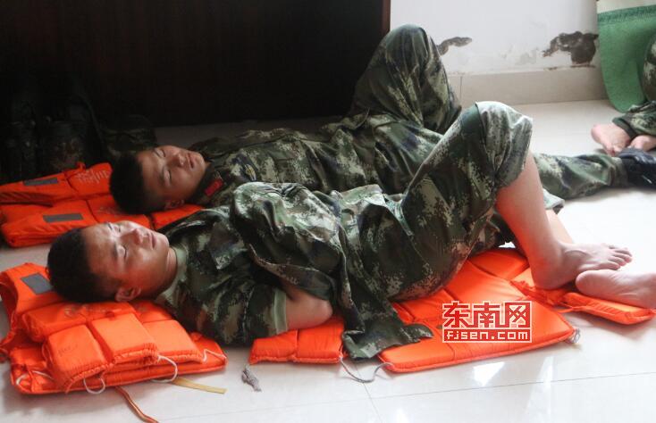 连续抢险救援工作中,武警官兵只能抽空休憩一会儿