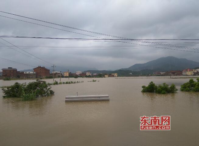 28日下午,东南网记者来到江口镇园下村看到,蒜溪水暴涨,已经快接近村里一座水泥桥的桥面,大桥桥面放置了封锁线。在河边的一些民房和田地因地势低洼,已经被洪水淹到,最深的地方,甚至淹了半层楼。紧邻的园顶村和顶坡村,有一些房子也被淹。