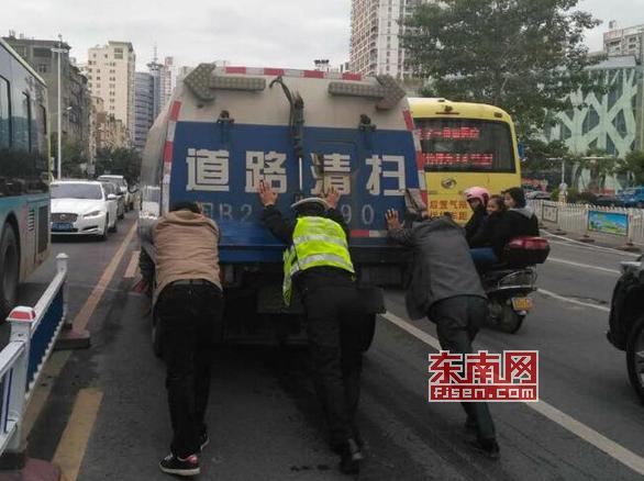 东南网莆田1月19日(通讯员 谢秋玲)1月17日下午2时10分许,莆田荔城交警大队一中队民警带队在红星美凯龙灯控路段执勤时,发现路口中间有一辆道路清扫车停在左转车道上。此时正处上班高峰期间,加上该路段来往车辆流量大,导致车辆通行受阻,影响正常通行秩序。 见此情景,民警立即组织人员上前查看。经询问得知,该车因为故障突然熄火后无法启动。民警立即启动采取措施,一方面,安排协警进行交通指挥、疏导工作,力争尽快将拥堵现象排除;另一方面,安排协警负责协调、指挥交通,提示周边车辆注意避让,为清扫车推向路边开辟安全通道。同时,让司机在车内掌控方向,然后自己与好心的路人、环卫工人一起将车辆推到了路边。 一中队及时处置突发情况的工作方式,及时保障了辖区道路交通秩序的安全、畅通,获得了过往司机、群众的一致好评。