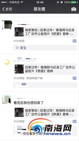 南海网、南海网客户端海口1月21日消息(南海网记者 刘麦)近两日,海南人的朋友圈被一部温馨公益短片刷屏,在外的游子纷纷发文或留言说,“今年,我一定回家过年。”短片和首映新闻被环球网、中国网、东方网等网站广泛转载。截至1月21日晚7时,该剧在知名视频网站优酷上的点击量已高达51.72万次,在文昌网的点击量也突破1万次。