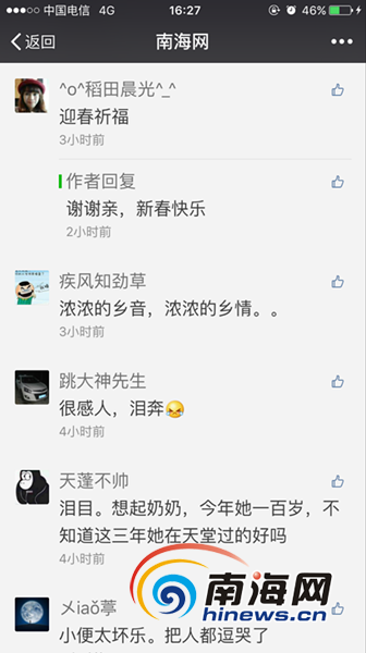 网友“阿拉伯数字的简单”说,“虽然我每个月都回家,但我还是看哭了。爸爸妈妈,我爱你们。 ”网友“天蓬不帅”说,“泪目,想起奶奶,今年她一百岁,不知道她在天堂过得好吗?”网友“疾风知劲草”评价,“浓浓的乡音,浓浓的乡情”。网友们在南海网各平台留言,纷纷表达对家人的思念和对影片的感悟,还有不少网友意犹未尽,关心电影的后续内容。