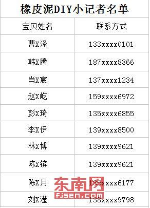 东南网莆田6月2日讯(本网见习记者 徐嘉馨)6月4日(本周日)下午3:00,荔城区委文明办、荔城区社科联联合东南网莆田站,邀请少通社小记者参加丰富生动的橡皮泥DIY趣味活动!今日,活动参与名单公布! 活动详情 主办单位:中共荔城区委文明办、荔城区社科联、东南网莆田站 承办单位:正荣时代广场、少通社 活动地点:正荣时代木棉广场 活动时间:2017年6月4日(本周日)下午3:00 备注: 本次活动为公益活动,无任何费用(每人有一位家长陪同)。活动结束后,小记者们需各自采写一篇与此次活动有关的稿件,发于“莆田东南网”微信板块“莆田13楼”和少通社邮箱:1141141233@qq.com。 咨询热线:13799008201或添加微信好友1141141233咨询。