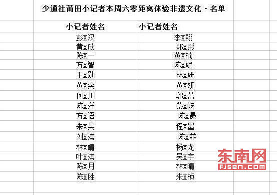 东南网莆田6月9日讯 明日(6月10日)上午,2017年中国“文化和自然遗产日”系列活动启动仪式将在莆田市群众艺术馆举行。当天上午,东南网·少通社将组织三十名小记者走进莆田市群众艺术馆,零距离接触非遗文化。今日,参与名单公布。 活动详情 主办单位:莆田市文化广电新闻出版局 协办单位:城厢区委文明办、东南网莆田站、城厢区教育局、少通社城厢站 活动地点:莆田市群众艺术馆 活动时间:2017年6月10日(本周六)上午8:30 关注“少通社”微信公众号。咨询热线:13799008201或添加微信好友1141141233咨询。 备注: 本次活动为公益活动,无任何费用(各携带一名家长参加,自带笔、纸、摄影器材等采访设备)。活动结束后,小记者们需各自采写一篇与此次活动有关的稿件,发于“莆田东南网”微信板块“莆田13楼”和少通社邮箱:1141141233@qq.com。