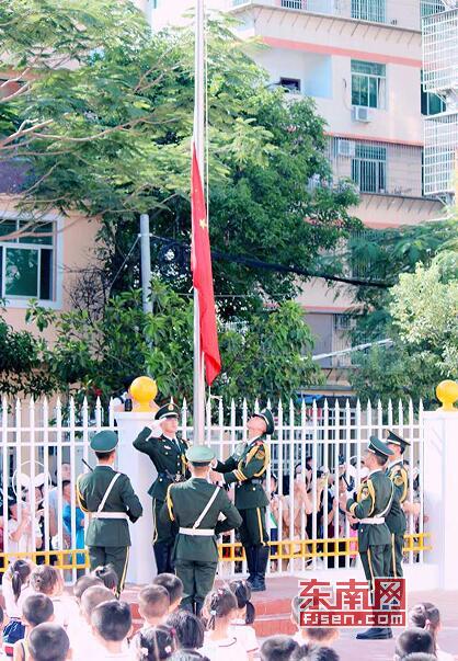 护旗手在孩子们的欢呼声中迎着朝阳阔步前进 东南网莆田9月26日讯(通讯员 李海德 林超 摄影报道)为了迎接和庆祝即将到来的国庆节,9月25日清晨,武警莆田支队四中队官兵走进莆田市机关幼儿园与孩子们一同举行升旗仪式,让孩子们在参与升旗仪式的过程中进一步萌发爱国情感。 当天,官兵们的出场,赢得了孩子们一片惊叹的尖叫声,庄严肃穆的神情、挺拔坚定的身姿、铿锵稳健的步伐震撼着孩子们小小的心灵。大一班小朋友陈咏柠激动地告诉妈妈:“武警叔叔好厉害!我长了也要像叔叔一样做一名升旗手,穿上军装保卫国家。” 最后,孩子们表演了《小海军》和小组唱《我爱北京天安门》,为祖国妈妈献上自己满满的爱意和祝福。