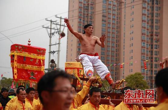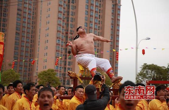 文艺表演结束后,涵江镇前村元宵出游正式开始。锣鼓喧天,巡游队伍渐次走过,随后是群众最期待的打铁球民俗表演。一袭白衣的乩童们坐在刀轿上,手提铁球,将铁球链绳在手指间提纵数圈,找到合适的长度后,便开始左右甩打在自己赤裸的背部,然后出宫,下轿,行走。巡游队伍在绕境布福的行程中,乩童会在不同的场合或间歇性的时间段中上轿打铁球。据悉,这种闹元宵方式表达了当地人民大无畏、不惧流血牺牲的英雄气概,同时也带着祈望境内新年风调雨顺,年丰岁足的良好愿望。