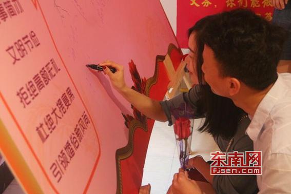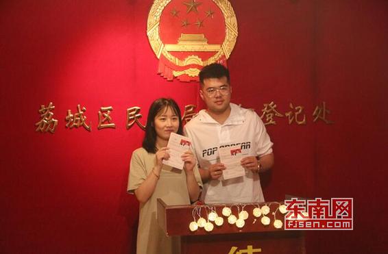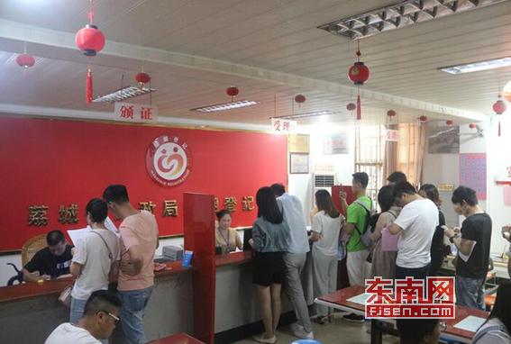 登记队伍 当天上午,东南网记者在荔城区民政局婚姻登记处看到,等着领证的新人们挤满了登记大厅,登记队伍甚至排到了走廊上。闷热的天气,也丝毫不影响扎堆登记结婚的新人。 活动现场,工作人员准备了信封和信纸,邀请新人们各自写一封爱情慢递信件,写给未来的自己及给对方的寄语。信件按照年、月收藏在登记处的婚姻咨询室,作为若干年后甜蜜的回首或者爱情争吵时的“回暖剂”。 在颁证室里,新人们共同宣读结婚誓词。庄严宣誓后,颁证员为新人们颁发结婚证书并送上玫瑰花,新人手持玫瑰现场求婚,场面温馨感人。工作人员还为一对对新人免费拍照留念,记录这美好的一刻。 据悉,随着人们生活水平的不断提高,对生活质量、婚姻幸福的要求也在不断提升。但是面对恋爱挫折、婚姻动荡、离婚率攀升、家庭暴力等问题的出现,极需专业的婚姻家庭咨询师提供辅导帮助,而婚前仪式感能让新人刻骨铭心这份承诺如海之深,把婚前的满心欢喜转化成婚后岁月的细水长流。
