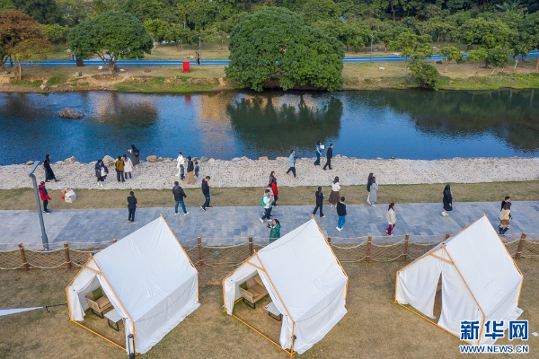 12月26日傍晚,市民、游客在泗华郊野公园游玩。该公园地处木兰溪支流延寿溪上游,溪水清澈见底,绿道蜿蜒绵长,已成莆田一处新的网红打卡地(无人机照片)。新华网 肖和勇 摄