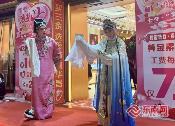 莆仙戏表演 夜幕降临,黄金街更添热闹。莆仙戏经典选段倾情演绎,国风乐队奏响悠扬旋律,多种文化表演在各家金店同步上演。传统文化元素与现代消费场景深度融合,打造出沉浸式体验空间,市民在感受节日浪漫的同时,消费热情持续高涨。周先生珠宝、华昌珠宝等店内,挑选首饰的顾客络绎不绝,夫妻、情侣手牵手围在柜台前,听店员讲解首饰寓意,偶尔相视一笑,满是甜蜜。