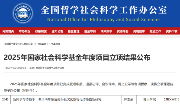2025年度国家社会科学基金一般项目立项名单截图 东南网莆田10月9日讯(本网记者 吴炳端 通讯员 郭朕晃 刘馥榕)近日,2025年度国家社会科学基金一般项目立项名单正式公布。莆田学院文化与传播学院帅志强教授申报的“基于两岸融通的妈祖文化数智化传播创新研究”项目(批准号:25BXW010)获得新闻学与传播学学科立项。 据介绍,当前,我国正大力推进国家文化数字化战略,进入智能传播时代,如何发挥数字化和智能化媒体在传播妈祖文化、推进两岸文化交流中的作用显得极其重要。帅志强教授主持的该项目采用情感传播的研究视角,结合共情传播、联锁社群等前沿理论,深入剖析妈祖文化数智化传播效果,探索传播创新路径。 项目研究内容涵盖妈祖文化数智化传播与两岸融通的机理阐释、数智化赋能两岸妈祖文化传播的图景与实践创新、提升妈祖文化数智化传播效能的创新路径等多个方面。主要采用大数据挖掘与情感内容分析研究新方法,设计面向两岸融通的妈祖文化数智化传播创新方案。 据了解,国家社会科学基金项目是我国哲学社会科学研究领域中层次最高、权威性最强、竞争最为激烈的国家级科研项目,是衡量高校哲学社会科学研究水平和综合实力的重要标志。该项目的成功立项,不仅是对帅志强教授学术研究能力的高度认可,也体现了莆田学院文化与传播学院在推动高水平科研、服务国家战略方面取得的新进展。 “近年来,我院全面做好有组织的高级别课题申报工作,深入动员老师申报课题,做到应报尽报,严把申报选题,组织申报书撰写指导,学院科研办把好形式关,为申报人员提供全面的服务和保障工作。”莆田学院文化与传播学院相关负责人表示,该院积极推进有组织科研,成立妈祖文化国际传播、智能传播、莆仙戏研究等科研团队,开展学术工作坊、北楼专家讲坛、紫霄讲坛、学术会议等学术活动,营造科研学术氛围。 据悉,前不久,2025年度国家社科基金艺术学立项项目名单也已公布,该院张丽娟博士申报的“明清徽州家族戏曲文献整理与研究”获批一般项目,文传学院2025年国家社科基金立项总数达到两项。2023年—2025年文传学院总共获批4项国家社科基金项目,其中艺术类1项,一般项目3项。 |