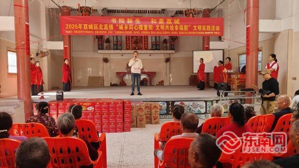 活动现场 东南网莆田10月29日讯(通讯员 许慧卿 文/图)岁岁重阳,今又重阳。10月29日,莆田市荔城区北高镇联合莆田市上善社会工作服务中心,在北高镇福岭村承志堂开展“书院新生和美荔城——2025年荔城区北高镇‘城乡同心暖重阳文明共绘幸福图’文明实践活动”,为老人送关怀,助城乡精神文明建设从“活动式互动”转向“常态化融合”。 活动现场,精彩纷呈的文艺表演拉开了序幕。手语舞《厚德载物》以优美的舞姿传递着满满的正能量,赢得了现场观众的阵阵掌声。紧接着,地方特色赞句环节登场,工作人员详细讲解重阳习俗,让群众在轻松愉悦的氛围中加深对传统文化的认知与理解,进一步增强文化自信。随后,志愿者组织福岭小学学生为老人赠戴红围巾、说祝福语,温馨画面让孝亲敬老理念扎根童心。