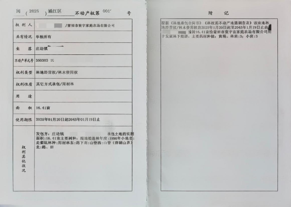 莆田首张林下经济《不动产权证书》 东南网莆田11月18日讯 近日,在莆田市自然资源局与市林业局等部门的指导推动下,涵江区庄边镇成功登记全市首张明确用于林下经济发展的《不动产权证书》。该证书标志着位于庄边镇的面积16.41亩的林地经营权及林木使用权获得法律层面的正式登记,是庄边镇深化林权改革、推动林下经济规范化发展的创新实践。 该宗地通过流转方式,将镇内的16.41亩林地的经营权与林木使用权依法登记至莆田市寰宇家庭农场有限公司名下,使用期限20年。该地块将专项用于发展林下黄精等中药材种植,是庄边镇推动“资源变资产”的生动体现。 此次不动产权证的登记,不仅为经营主体提供了清晰的产权保障,也为林下经济融资与发展奠定了法律基础。通过明确产权边界、稳定经营预期,有效激发了市场主体参与林业经营的积极性,为后续引入金融支持、扩大生产规模创造了条件。 这张林下不动产权证的落地,是莆田市推动林业高质量发展、助力乡村振兴的重要举措。通过理顺产权关系、激活沉睡资源,为新质生产力在林业领域的成长提供了制度保障,也为全市林下经济的规模化、标准化、数字化发展树立了新标杆。(庄边镇 供稿/图) |