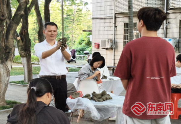 陈春晖示范塑泥。叶之宸 摄 东南网莆田11月19日讯(本网记者 金晶晶 通讯员 叶之宸 董昊天 温林凤)近日,国家级非遗“莆田木雕”“莆田非遗陈氏工艺雕塑”双料代表性传承人陈春晖走进莆田学院学生社区,以“泥土的无限可能”为主题,带来一场传统技艺与现代创意碰撞的泥塑传习课,让千年泥土在青春指尖焕发时代光彩。 活动伊始,陈春晖以“泥塑的前世今生”为切入点,生动追溯这门古老技艺的发展历程。他在娓娓道来中更着重强调:“泥塑不只是造型手艺,更承载着中华民族代代相传的审美情趣与文化基因,守护这份遗产,就是守护‘文明’的根脉。” 随后,陈春晖聚焦泥塑创作核心,系统拆解揉泥、塑形、雕琢三大技法,并亲自示范“手随泥走,力由心发”的创作精髓。只见他双手轻握粗砺泥料,指尖精准调控力度,揉捏间泥料逐渐细腻柔润,短短几分钟,一只线条流畅、形态饱满的小碗雏形便跃然眼前,引得同学们连连赞叹。
