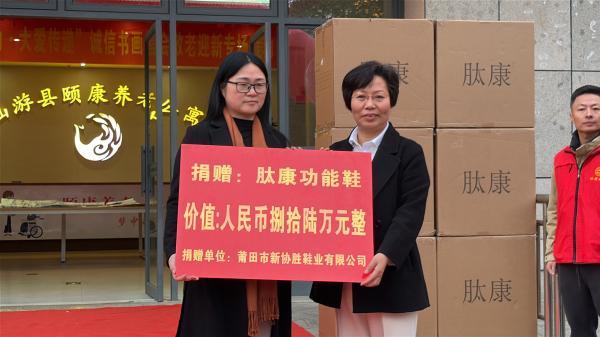 新协胜向养老院捐赠700双肽康智能穿戴功能鞋 此次活动得到了众多爱心企业的大力支持。活动现场,出席领导为爱心企业颁发荣誉证书,对他们的善举表示衷心感谢和高度赞扬。“为了践行企业的社会责任,回馈社会,新协胜向养老院捐赠700双肽康智能穿戴功能鞋。”莆田市新协胜鞋业有限公司业务代表苏锦艳介绍,此款鞋子具备防跌、养护、抗疲劳等功能,希望为老年人的出行安全和生活舒适贡献一份力量。 此外,书画名家还怀着满满的新年祝福,将精心创作的书画作品赠予仙游县颐康养老公寓和爱心企业,以此表达新年问候与美好祝愿,为活动增添一抹亮丽的文化色彩。
