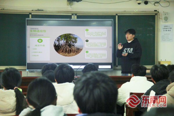宣讲现场 东南网莆田2月6日讯(通讯员 阙丽君 陈雅彤 李尤 文/图)近日,莆田学院“蓝海薪传”社会实践队走进湄洲岛妈祖中学,通过生动讲解、趣味实验与互动交流,为高一学生带来了一场集知识性、趣味性与实践性于一体的红树林保护科普活动,用实际行动在学生们心中播撒守护海洋生态的种子,点亮青少年关注生态、践行绿色的初心。 “红树哪里‘红’?”实践队成员薛炎辉以这一有趣问题切入,向同学们揭示名称由来——红树体内富含的“单宁酸”在接触空气后,会被氧化变红。这一生动的化学现象,迅速激发了在场同学的好奇心与求知欲。随后,实践队借助精心准备的科普课件,系统讲解红树林生态系统的独特结构与重要功能,强调其在净化水质、防风固滩、维持生物多样性等方面有着不可替代的作用,并深入阐释加强红树林保护的现实意义。 聚焦莆田本土实践,实践队特别回顾了湄洲岛从“只长石头不长草”的生态脆弱岛,到如今森林覆盖率高、红树林成为亮丽名片的生态示范岛的蝶变历程:这一转变始于习近平总书记当年“把湄洲岛建设成生态岛”的殷切嘱托。实践队详细介绍了近年来湄洲岛为践行嘱托、保护红树林所实施的一系列生态修复工程,包括“一补一育一造”项目、西亭澳红树林海湾蓝碳增汇工程及困难立地造林实践等。目前,湄洲岛红树林生态公园内绵延超1000亩的“海上森林”,正为海岛构筑起坚实的生态屏障。 为将抽象知识转化为可感知的体验,实践队精心设计了一场科学实验。队员们细致讲解碘量法检测红树林水体含氧量的原理,直观展现水质优劣与红树林生长的密切关联,让生态保护知识变得可观可感,也引导同学们认识到科学监测在生态守护中的重要性。 实验激发了同学们的深入思考。面对“是否所有红树林都抗盐?”等踊跃提问,莆田学院环境与生物工程学院生态学专业青年博士教师徐超群以生动比喻和专业讲解作出细致解答:“并非所有红树林都具备同等抗盐能力,就像有人喜辣,有人喜欢嗜咸。”他用生活化的类比,深入浅出解释了不同红树植物通过“拒盐”或“泌盐”等生理机制适应高盐环境的奥秘,并延伸讲解了红树林抗盐特性对于稳固海岸线、抵御侵蚀的重要作用,有效拓宽了学生的生态认知视野。