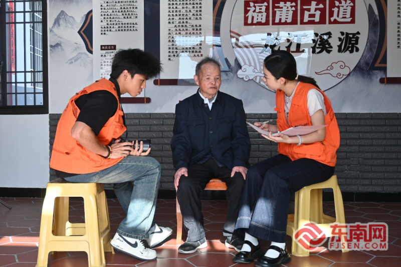 2025年4月15日,莆田学院“时光小分队”队长李欣怡(右)和队员蔡小铭(左)深度采集莆田市大洋乡老交通员邱庭灶(中)的红色记忆。杨心怡/摄