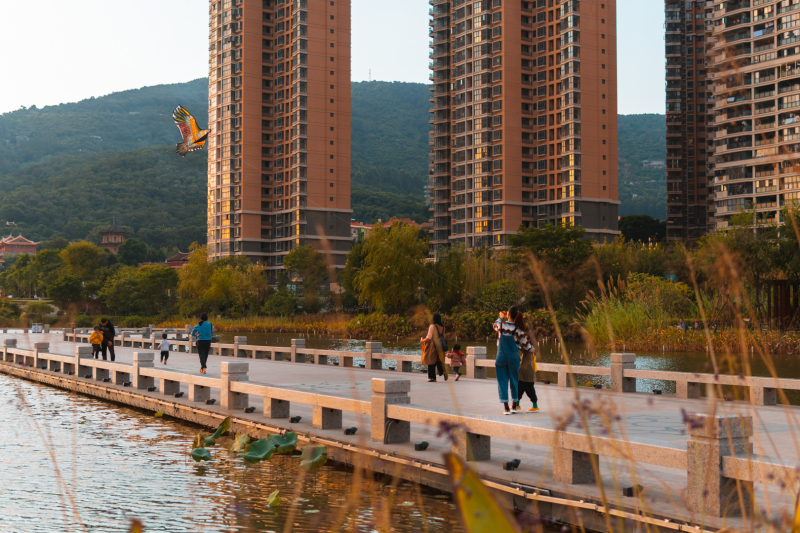 南湖公园与广化寺前广场,许多市民带着孩子放风筝
