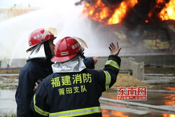 莆田消防支队增援力量到场后,首要任务是出两干线,在中间过道架设水炮阵地,给处于明火下风向的101和102常渣油罐冷却保护。