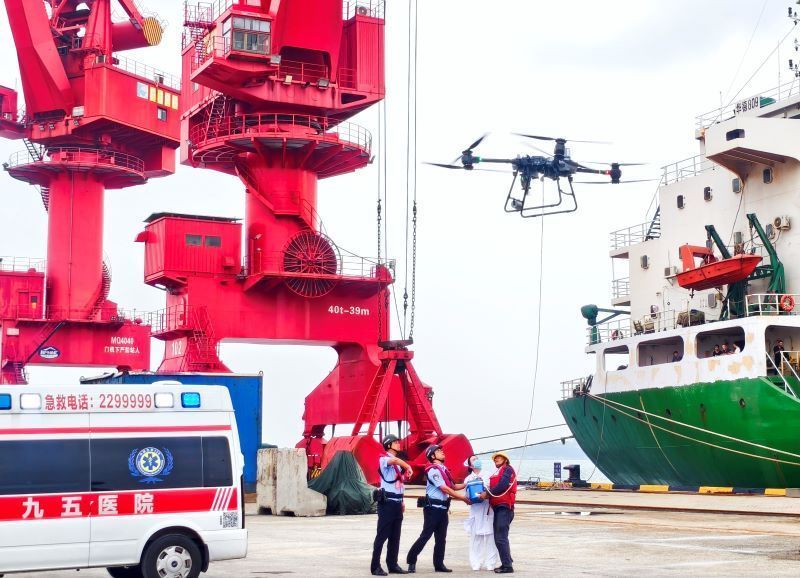 在莆田市秀屿港区,医疗专用无人机送达20斤急救药品。(吴志/摄) “意外”却在此时模拟发生:道路“中断”!几乎同时,边检执勤民警王斌斌发出急救药品紧急需求。指令飞传,莆田九十五医院的回应是“无人机已起飞”。一架装载20斤急救药品的货运无人机呼啸升空,越过“受损”路段,精准飞抵港区上空,平稳降落在指定点。“药品已安全接收!”王斌斌报告声铿锵有力。 从陆地与空中的接力速递,到云端与现场的智慧联通,这场为期两天、跨越物理与虚拟空间的演练,完整呈现一场立体化的应急医疗救援。“这不仅是演练,更是中国港口面对风险时日益坚实的底气与从容。”莆田边检站执勤二队民警黄咸乐介绍说,它考验的不仅是速度,更是多部门协同精度与科技赋能深度。当无人机精准送药、专家影像实时共享、救护车与巡逻车并肩呼啸,一幅以“人民至上、生命至上”为理念、守护国门安全的生动画卷清晰展现。 |